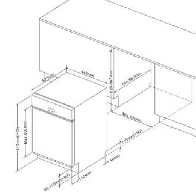 Inbouw: De vaatwasser is ontworpen als een deels geïntegreerd inbouwapparaat met een breedte van 44,8 cm.