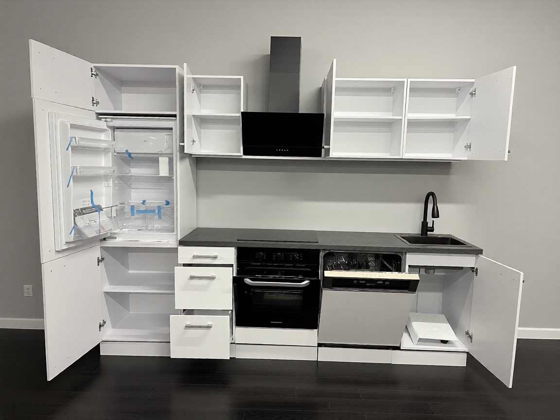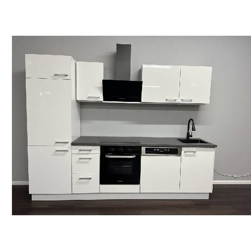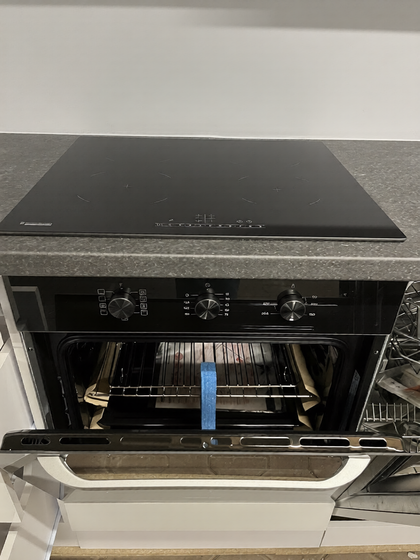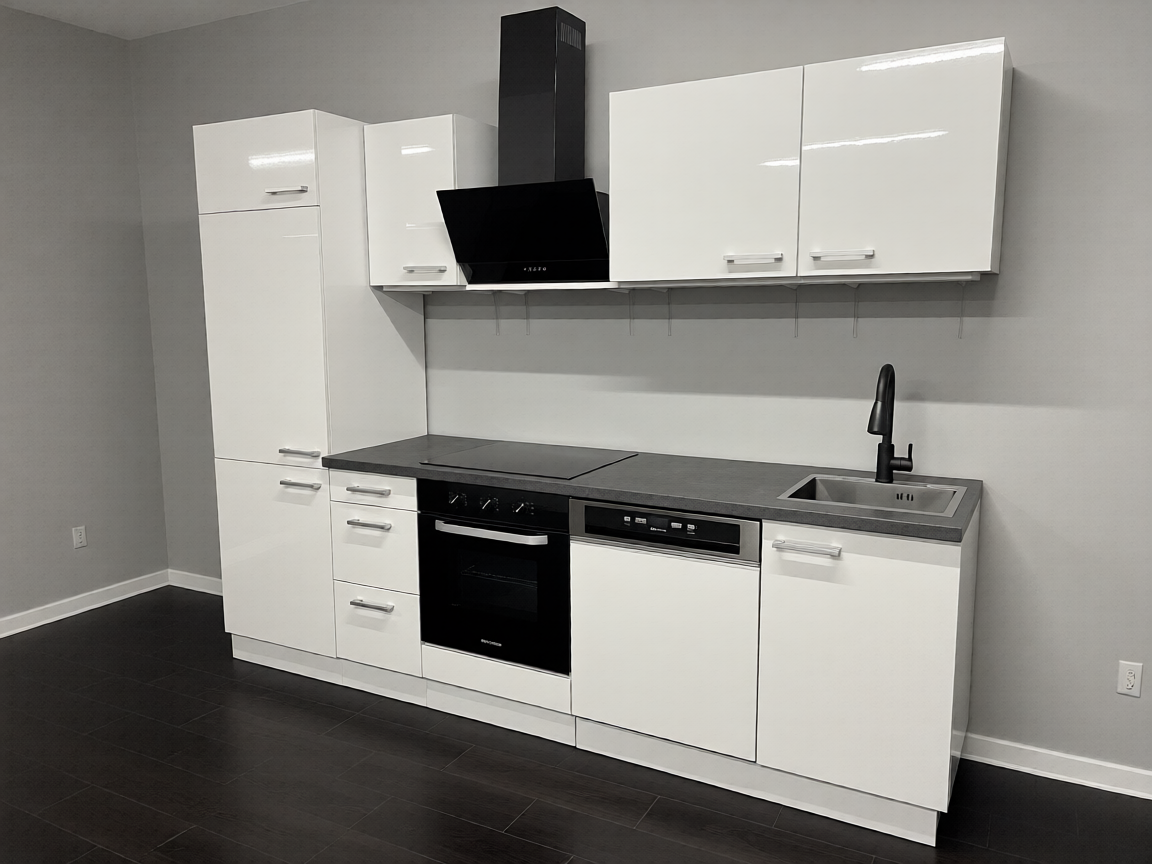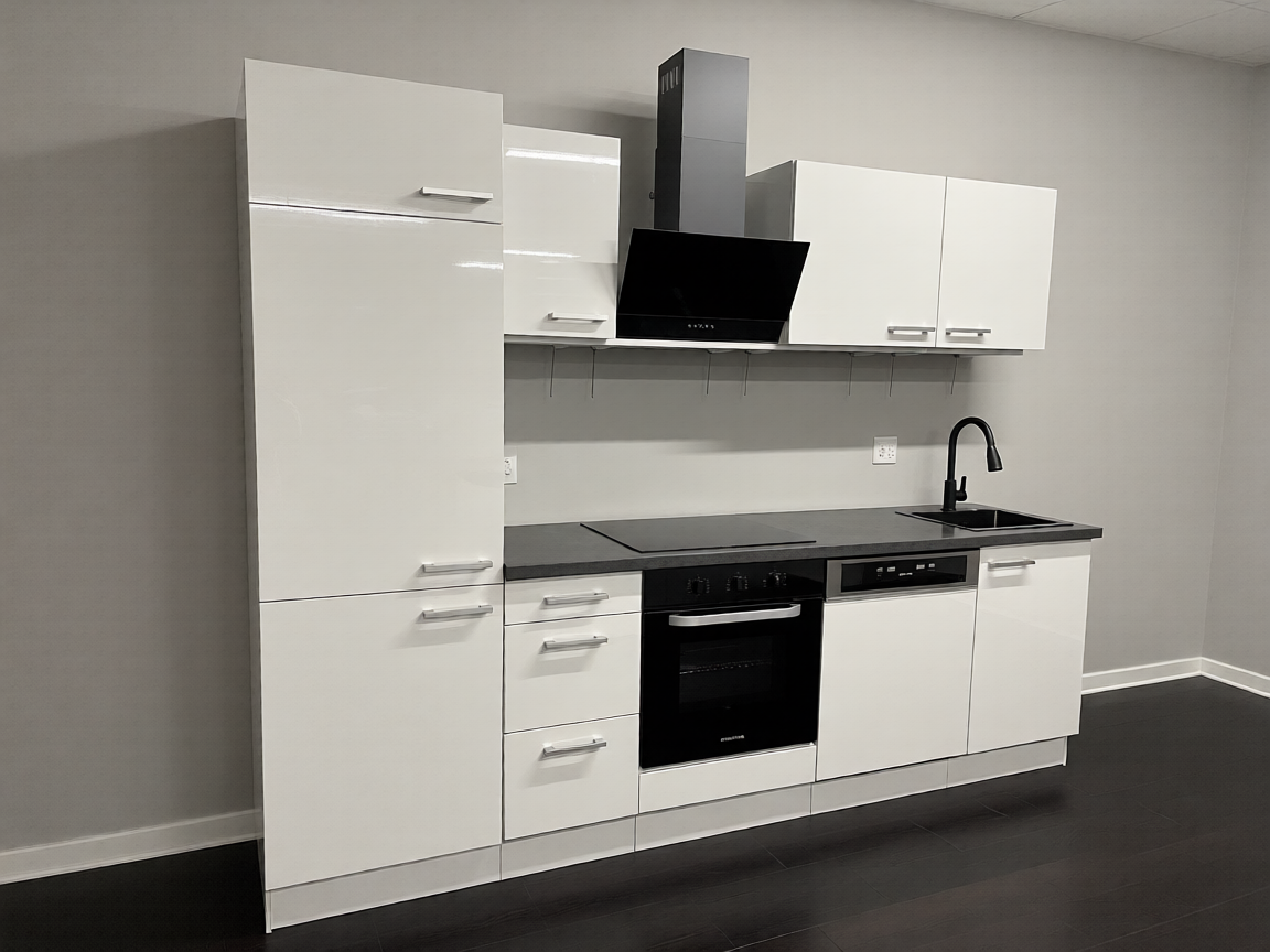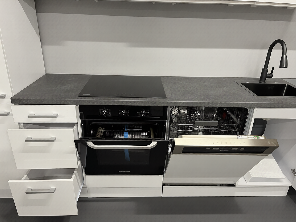 Compleet nieuw keukenblok hoogglans wit/zwart met apparatuur.