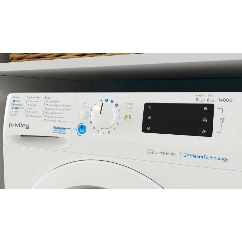 Deze Privileg PWWTV X 96H69 wasdroogcombinatie is voorzien van een 9 kg trommel voor wassen en 6 kg voor drogen, 1400 toeren en tevens een inverter motor. De Privileg PWWTV X 96H69 wasdroogcombinatie heeft energielabel D, stoom functie en eco/kort/auto programma. Het betreft een Duits display, beladingsherkenning en aquastop. De machine heeft 2 jaar fabrieksgarantie (10 jaar garantie op de motor). B-keus product, kan een licht krasje of deukje bevatten.
